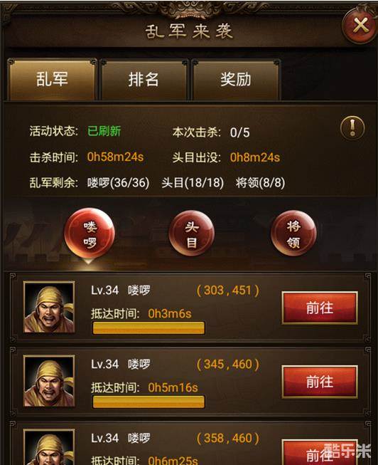 由于每位玩家只能击杀5个叛军。故而可以根据实力来,实力较弱的可以活动开始尽量早点刷咯罗和头目,实力强劲的则可以等待一下刷出将领。同时由于数量有限,为了保证击杀乱军,可以考虑元宝加速,保证获得奖励。