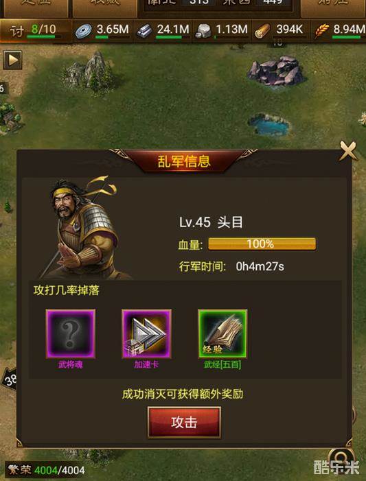 头目比咯罗档次较高,一般由200左右的四级兵种构成,战力为2M左右,实力中等。战胜可得叛军银箱和加速卡或者经验书。