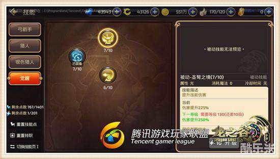 觉醒之后获得的两个被动技能也是能让谷民伤害狂增的,很多小伙伴总觉得被动技能看不见摸不着,犹如鸡肋。但我们细细分析,觉醒后的被动技能大有用处,以银色猎人为例,觉醒后他的被动技能的功能是提高技能伤害,并且附带超级盔甲攻击和超级盔甲防御。一个是提高大招圣弩之境的,120级最多能将觉醒技能提升至7级,7级时能将圣弩之境的伤害提升225%,每升一级提高25%,可见满级后能提升3倍的伤害,力量无穷!