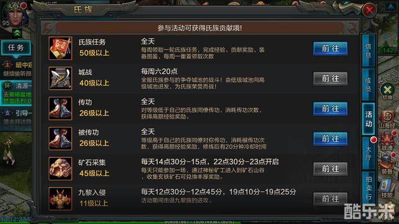 中午12:30-12:45开启九黎入侵第一次,九黎入侵奖励大量的经验、氏族贡献和氏族拍卖奖励,九黎入侵每天可以参加两次。在九黎入侵开启前,需要提前在氏族庄园九黎怪物的刷新点等待,如果自己的氏族是排名靠前的大氏族的话,只需要六七分钟即可打完60波怪物,所以一定要计算好九黎的时间。