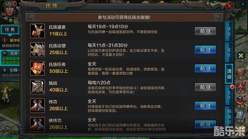 最后编辑于7年前《QQ华夏》手游中的许多活动玩法都是在建立在氏族的基础上的,参与氏族活动玩法可以获得丰厚的奖励和海量经验,这些氏族活动包括九黎入侵、氏族盛宴、氏族押镖、抢聚宝怪和世界首领等活动。大多数氏族活动都是限时活动,在了解到氏族活动时间后可以避免错过活动。