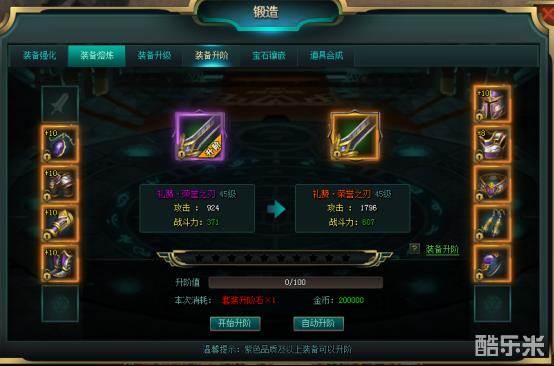 装备升阶面板,可以对角色装备进行升阶,提升装备的品质、属性和战力。(1)紫色和紫色以上品质的装备才可以升阶;(2)不同等级的装备可提升的最高品质不同;如果某个等级装备已提升到最高品质,可以先提升其等级再去提升其品质;(3)升阶需要的材料,可以通过商城购买和合成获得。