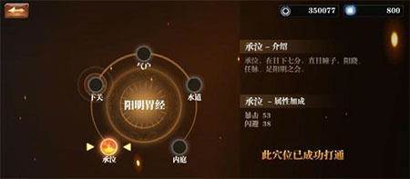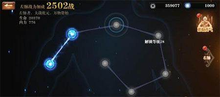 除了秘籍系统之外,还有我们所熟悉的经脉系统。经脉系统分左脉与右脉。左脉者,大哉乾元,万物资始,主加成生命和内力。右脉者,至哉坤元,万物资生,主加成暴击和闪避。左右两主脉各分七脉,每一脉分五个穴位,每个穴位皆需要真气来打通。