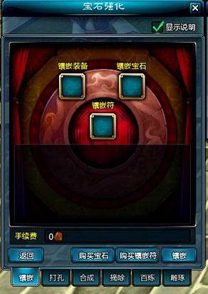 镶嵌:在已有孔的装备上进行宝石镶嵌,镶嵌4级以上(含4级)宝石需要放入宝石镶嵌符,宝石镶嵌符分初级、中级、高级3种。