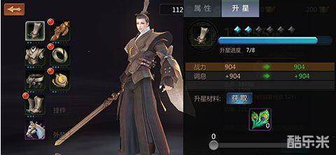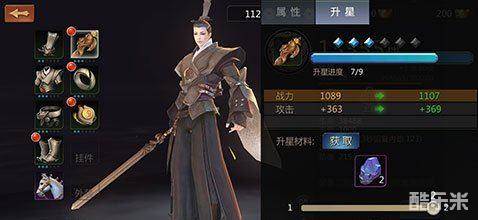玩家在属性界面点击相应的装备可以看到该装备目前增加的属性以及战力情况,如果包裹中有该装备的升星材料,还可以看到升星过后带来的属性和战力增长情况。装备升满6星且满足江湖阅历的条件可以进行进阶,装备的颜色也会往绿-蓝-紫<-橙依次变化。
