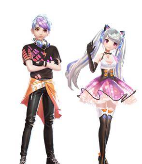 男生一身黑色印花短袖搭配皮裤,简洁大方,蓝紫挑染的头发与脖间耳机相称,腰间亮色外套实属点睛之笔。双马尾搭配抹胸蓬群,成熟中透出一丝俏皮,黑色过膝高跟鞋更是衬出女生修长腿型。