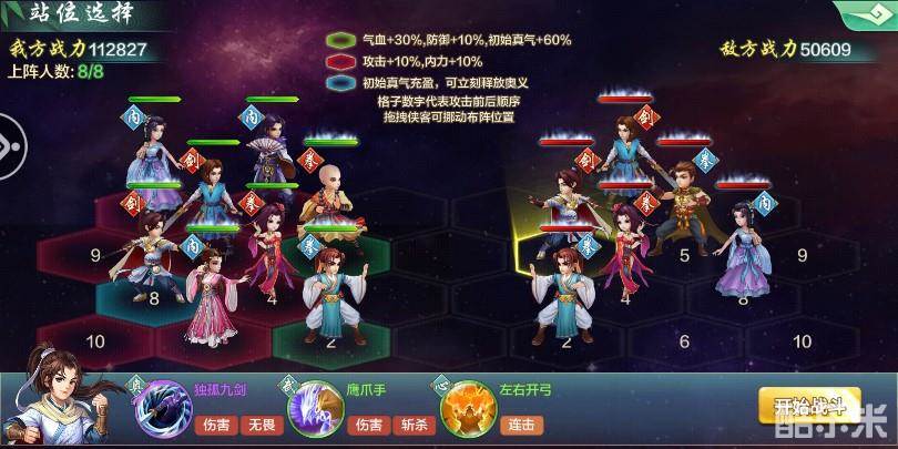 游戏中,每个角色依照不同的感悟,具有不同的战斗特性。讲究以柔克刚的角色能够利用卸劲来抵御敌人的攻击,以静制动的角色能够适时的反击敌人……为不同的队友选择不同的发展方向,队伍的组成与搭配将更为重要。