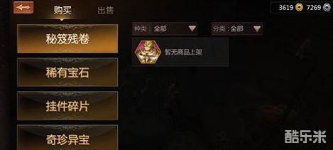 拍卖行购买页面中一共分为四类,秘籍残卷、稀有宝石、挂件碎片、奇珍异宝。玩家可用银两购买自身所需物品。在拍卖行购买所获的物品将变为绑定状态。