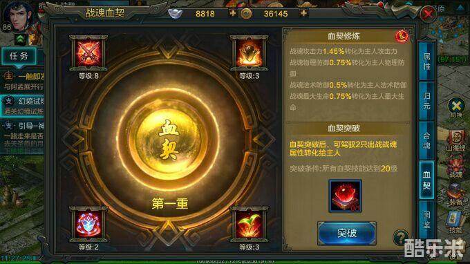 血契等级分为四重,毎重20级,每级都能提高属性的转换比,在突破二重、三重、四重的时候分别可以驾驭两个、三个、四个出战战魂的属性转化给玩家,血契最多可以驾驭四个战魂的属性转换给玩家。血契有四个技能,分别是战吼、钢甲、抗法和培元。战吼可以把战魂的攻击以百分比的方式转化为玩家的攻击力;钢甲可以把战魂的物理防御以百分比的方式转化为玩家的物理防御;抗法可以把战魂的魔法防御以百分比的方式转化为玩家的魔法防御;培元可以把战魂的最大生命值以百分比的方式转化为玩家的最大生命值。