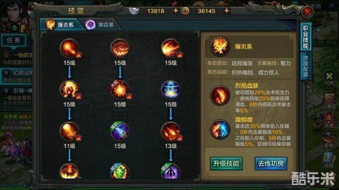 冰法的天赋技能烈焰血脉本身自带增加百分之20的法术攻击,使用技能有百分之20的几率在6秒内提高百分之5的法术暴击率,天赋技能躁郁症在火法暴击后有百分之35的几率陷入暴躁状态,暴躁状态下法爆伤害提高百分之10。被动技能淬法者永久增加百分之比的法术攻击和百分比的防御(随技能等级增加)。大部分技能带有灼烧状态再加上一个被动技能烈焰护体,让火法在输出能力上有很大的优势。两个百分比攻击加成技能又增强了火法的输出能力,但是火法的弊端也是很显然的,高伤害的火法一般都是敌方的目标,再生存能力上火法还是比较欠缺的。