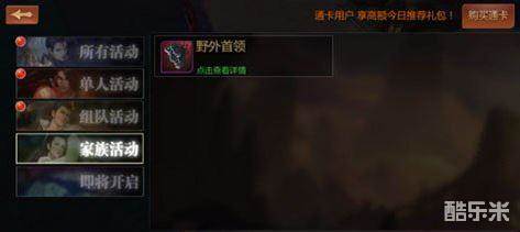 剑侠世界手游野外首领怎么打,参与详情分析,剑侠世界手游野外首领是家族活动之一,玩家可以与家族中的成员一起参加获取丰厚奖励,点击主界面上方的活动按钮选择左侧家族活动,在开启时间内点击野外首领参加按钮进入。