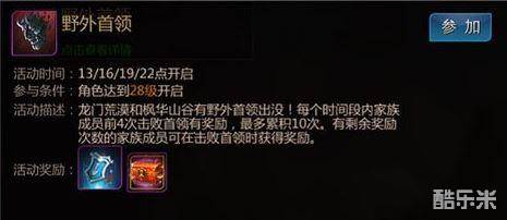 家族野外BOSS争夺战,挑战是由个人参加,以家族为单位进行;点击家族活动内的“参加”按钮即可传送到BOSS争夺的地图!每天13、16、19、22点开启;开启后,大侠可以和所在的家族成员一起进入野外地图【龙门荒漠】或者【枫华山谷】开始争夺战,对BOSS造成伤害前三名的家族将会获得丰厚的奖励!注意,如果大侠没有加入任何家族,就不能上榜。