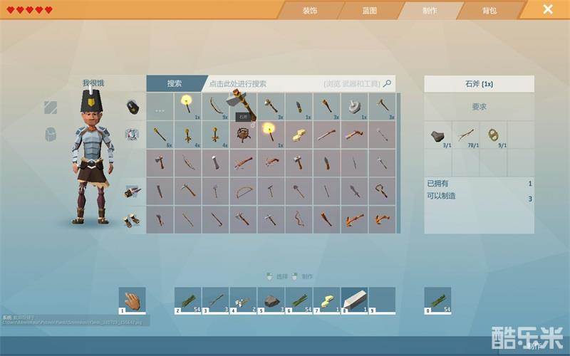 按下TAB键,打开“制作”,就可以看到你能够制作的工具了。前期通过搜集材料,我们可以制作例如:石斧、石锤、石镐等工具。
