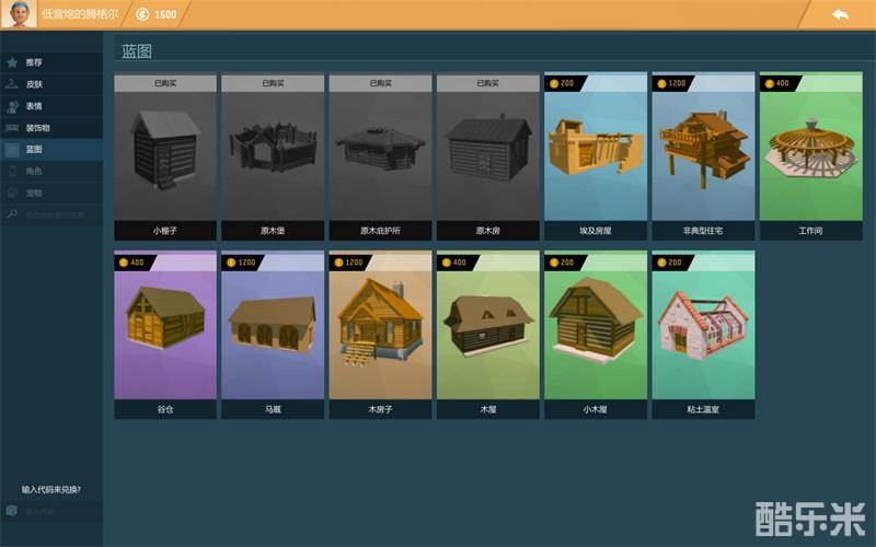 在商城中,找到“蓝图”选项,可以免费领取三张蓝图(包括:原木堡、原木庇护所、原木房),如果你有足够的金币,也可以购买你所喜欢的蓝图(这里,我就买了小棚子)。