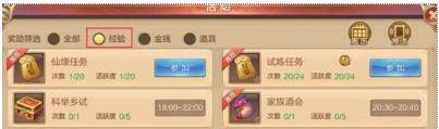 大家来看,点击活动图标,点选经验部分。像我这样的没有时间星人,只是追求等级的话,就按照这样的任务,每天24次试炼(1小时)、20次仙缘(半小时)、20点半家族酒会(十分钟),18点科举乡试(5分钟)。好好升级,开心游戏。
