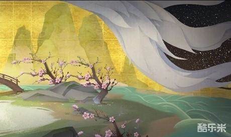 山峦层叠,碧水环绕,旭日从山间慢慢升起。石壁漫上零星青苔,低声问早的微风唤开粉樱。拱桥上的凉亭看着浪花迭起,等待来客。金箔铸造的穹顶,灿灿生辉却也轻薄可摧。