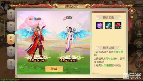 (1)挑战副本需夫妻双方同时在线,每天可以免费通关一次。