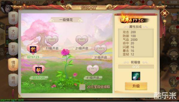 (2)升级情花需要消耗仙缘玉露,通过仙侣副本可获得仙缘玉露。