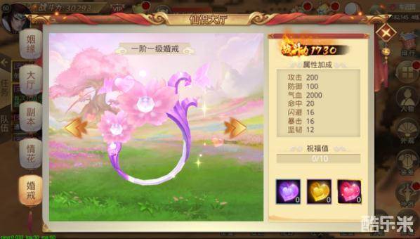 (3)当祝福值满时婚戒可提升至下一等级,升级婚戒可获得更多属性。