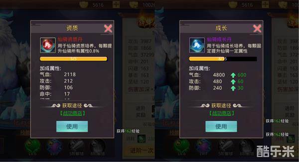 在系统模块达到3阶之后,可使用对应的“成长丹”,每颗“成长丹”可为人物角色增加攻击、防御、气血属性。系统模块达到4阶之后,可使用对应“资质丹”,每颗“资质丹”可以提升对应模块所有属性0.8%。模块的阶数越高,可使用的成长丹和资质丹越多,同样每颗成长丹和资质丹增加的属性越多。
