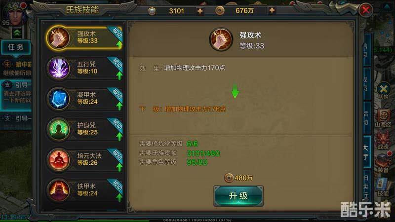氏族技能的升级也是一个日积月累的过程,通过升级氏族技能能够永久增加属性,升级氏族技能或消化铜钱、氏族贡献和经验。对魔医来说,增加物理攻击力的强攻术和增加暴击率的破敌术比较重要,这两个技能要尽量升满。不过氏族技能的等级越高,升级花费的铜钱或经验也越多,也应该适当升级一下那些增加防御、生命值和免伤的技能,这样可以稳定增加战斗力。