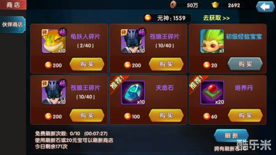 至于升级的经验宝宝,突破的突破丹等道具,可以通过商店购买,这个商店不是元宝商城,而是用元神购买的那个商店,元神可以通过捉妖夺宝,和分解伙伴获得,那些没用的伙伴可以拿来分解,换取各种道具和需要的伙伴魂魄.
