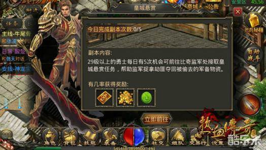 除此之外29级以上勇士,每日有5次机会可前往监军处【比奇,X:59,Y:23】接取皇城悬赏任务,帮助监军捉拿劫匪夺回被偷去的军备物资,可获得大量经验、金币以及声望。