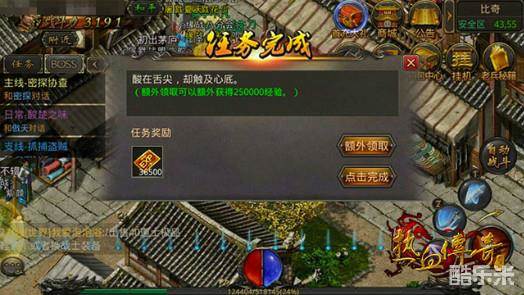 玩法:玩家可以自己手动完成任务或者通过使用元宝来一键完成。使用元宝一键完成不仅可以节约时间,还能够获得额外的奖励哦!例如:日常——酸楚之味中,顽疾通过元宝一键完成可以获得250000个经验值。