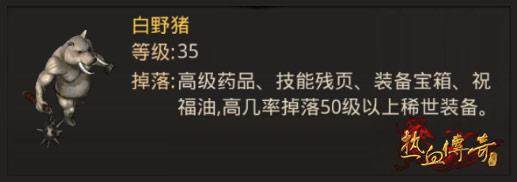 白野猪:红色恶猪的头领,不知道它已经活了多久。由于更长的寿命而有着比红色恶猪更大的体型和更强的破坏力,出现于石墓三层。世界级BOSS。击杀掉落高级药品、技能残页、装备宝箱、祝福油,较高几率掉落50级以上稀世装备。掉落产出飞燕履、风云战靴、水火双层履。