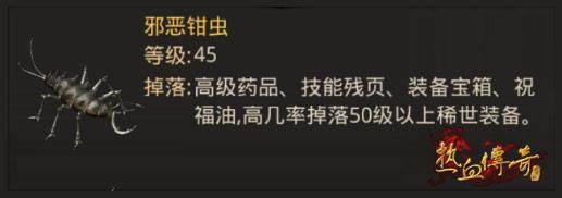 邪恶钳虫:这种巨大的钳虫在相当长的时间里起了变异,不能与普通的钳虫相比。它们几乎能毫无怜悯的除掉任何敌人,出现于死亡棺材。世界级BOSS。击杀掉落高级药品、技能残叶、装备宝箱、祝福油,高几率掉落50级以上稀世装备。掉落产出水火丝绦、君子配腰、荆棘腰带。