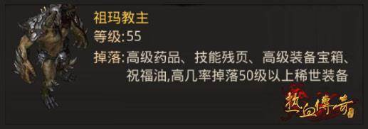 祖玛教主:祖玛教众把恶魔的石像供奉为它们的神。它是一尊站立在祖玛神殿深处的神像,当入侵者靠近它就会苏醒。坐镇祖玛教主之家。世界级BOSS。。击杀掉落高级药品、技能残页、高级装备宝箱、祝福油,高几率掉落50级以上稀世装备。
