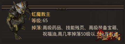 虹魔教主:曾经是名震玛法的英雄人物,但却受到黑暗力量的诱惑,成为了让整个大陆为之恐惧的恶魔,出没于封魔殿。世界级BOSS。击杀掉落高级药品、技能残页、高级装备宝箱、祝福油,高几率掉落50级以上稀世装备。掉落产出逍遥扇、龙纹剑、龙牙、怒斩、嗜魂法杖、屠龙。