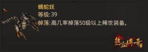 蝎蛇妖:蝎蛇妖存在于石墓一层。击杀掉落金币、中级药品、20级装备等。有较低几率掉落30级装备。