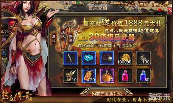 这次开测,官方搞了个“首充大礼”活动,首次充值可以获得价值1888元的礼包!好吧,小编只想说这“1888元”几个字只是一个噱头,不过甭管噱头不噱头,送的东西可是真的蛮实用!里面有职业对应的武器、衣服、项链、100000金币、100个黑铁矿石+1(绑)、10个小飞鞋、20个试炼凭证、10个太阳水(大)、50个金创药(中量)、50个魔法药(中量)。礼包中的武器和衣服是没有等级限制的,可以直接装备,项链是有30级等级限制了。新手玩家在装备上武器和衣服后,战斗力马上就上来了,做起前期的一些任务来也是更快了!