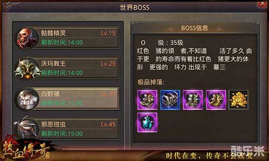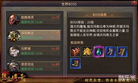 这个阶段,玩家等级差不多了,就可以申请加入行会与行会的成员们一起组队开刷世界BOSS,要注意世界BOSS的开刷时间,骷髅精灵和沃玛教主算是新手期比较容易打的,它们的刷新时间在下午2点,击杀它们有机会获得稀世装备奖励。