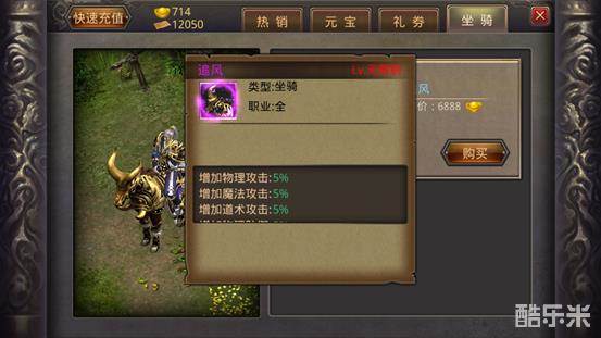 对于土豪来说,坐骑是个至高无上的荣誉,不管走到哪都是身份地位的象征,骑马过街,一种俯视众生的感觉,相当的拉风。游戏中坐骑有两种,一个是追风,另一个是炽焰;首先追风可在商城购买,只需花6888元宝,就可获得全属性5%的加成,外形酷炫。而炽焰,则比追风更高一个档次,运气好的话可在云游商人处购买。