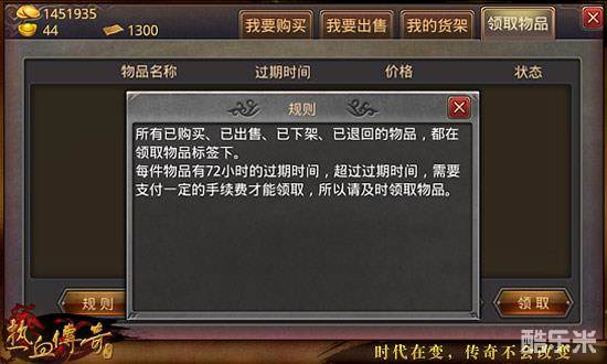 4、卖东西收钱、买东西收货、已退回物品、已下架物品都是通过交易行“领取物品”进行,超过72小时未领取,玩家需要支付额外的手续费领取物品。