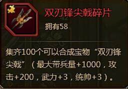 ① 双刃锋尖戟:聚集100个碎片可以合成双刃锋尖戟,属性加成是最大带兵量+1000、攻击+200,武力+3,统帅+3.