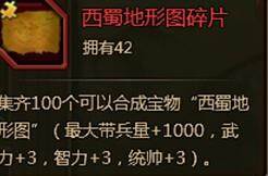 ② 西蜀地形图:收集100个碎片可以合成西蜀地形图,属性加成最大带兵量+1000,武力+3,智力+3,统帅+3.