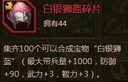 ③ 白银狮盗:收集100个碎片可以合成白银狮盗。属性加成最大带兵量+1000,防御+90,武力+3.智力+3.