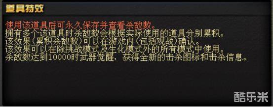其次便是这款英雄级武器的另一个属性了,在使用该武器后可永久保存并查看杀敌数,在挑战和生化模式中并不记录,在杀敌数达到10000时产生武器觉醒的效果,会获得全新的击杀图标和击杀信息。这么神秘的效果,更是对我们日常练习枪法的变相鼓励了!