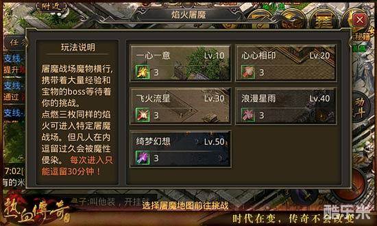 40级有一定的装备之后,可以与行会玩家组队,开着双倍经验卷轴,去打焰火屠魔。选择适合自己战力的层数,引怪过来一起打,经验的获得也是比较多的。