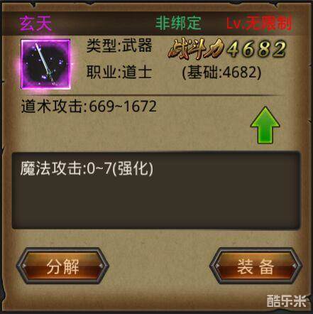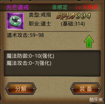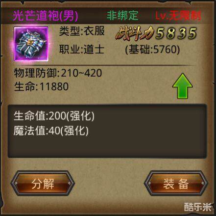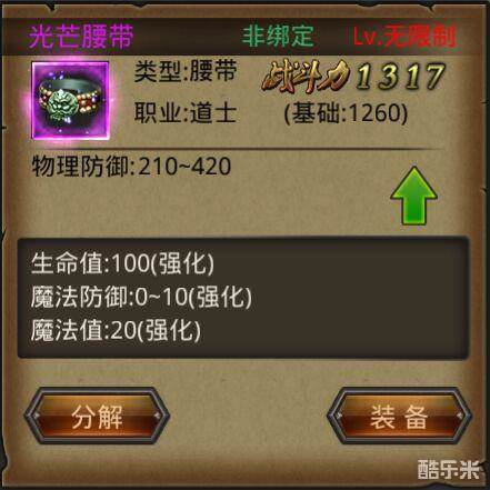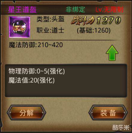 装备是支撑玩家战力的重要组成部分,装备好的武器、饰品可以大幅提升玩家战斗力。装备越好,战斗力越高。装备品质由低到高分别有白色、蓝色、紫色等(绿色是套装),以道士职业的的紫色顶级装备为例: