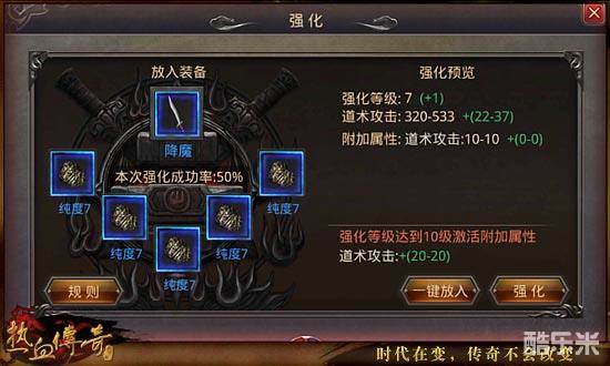 通过装备的强化可以进一步提升战斗力。玩家消耗黑铁矿石和玄冰铁对武器、戒指、腰带、鞋子和头盔5个部位进行强化。强化+1到+10需要消耗黑铁矿石,强化+11到+20需要消耗玄冰铁。强化材料纯度越高,强化的成功率越大。装备强化将大幅提升角色的战斗力,强化等级越高,提高的战斗力也就越多。