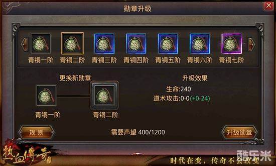 提升勋章等级可以提高角色的战斗力。玩家可通过皇城悬赏、除魔任务获得声望来升级勋章。勋章品阶分为青铜、生铁、黑铁、白银、黄金五个段位,每个段位又分为9个品阶,最高品阶为黄金9阶。勋章等级和品阶越高,所提供的属性加成和战斗力加成就越高。青铜一阶的勋章战斗力90点,黄金9阶勋章战斗力高达7059点。