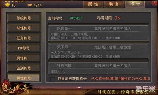 玩家在游戏、任务过程中会获得不同的称号,有等级称号、杀怪称号、任务称号、PK称号、爬塔称号、签到称号、稀世称号。不同的称号会提供不同的属性加成,称号可以提供攻击、生命、魔法防御、物理防御、生命几项属性值。玩家在获得称号后,即可获得相应的属性加成,称号所增加的属性均为永久增加。