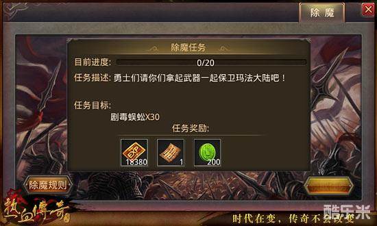 等级达到20级时,即会开放除魔任务。大家每天可以进行20环的除魔任务。完成除魔任务可以获得200点声望值、大量经验和技能残页,除魔任务单日可累积获得4000点声望值。
