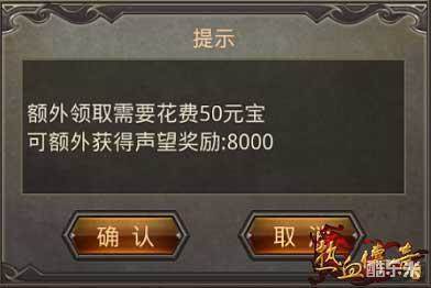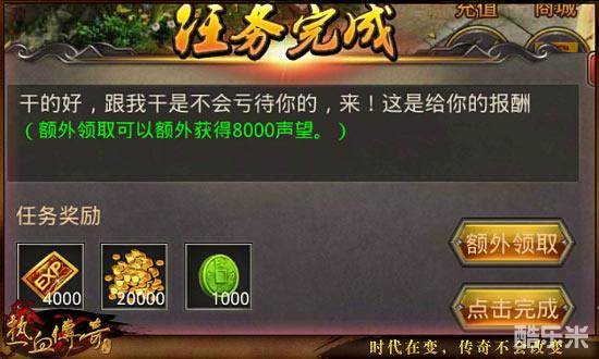 此外,29级以上玩家可在比奇监军处接取皇城悬赏任务,每天可完成5次悬赏任务,完成任务即可获得经验、金币和声望值奖励。完成皇城悬赏任务每次可获得1000点声望,完成5次皇城悬赏即可获得5000点声望值。玩家还可选择“一键完成”,使用50元宝一键完成任务,可以额外获得8000点声望值。