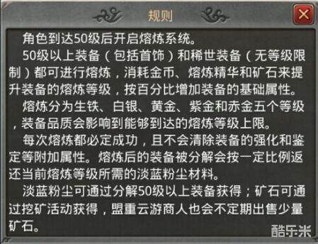 角色达到50级,就可以使用熔炼功能,所需材料获取途径是,分解50级及以上装备首饰获得,矿石挖矿有机会获得。50级以上装备可进行五次熔炼,每次都是必定成功并提升属性。装备分解后返还一定的基础材料。