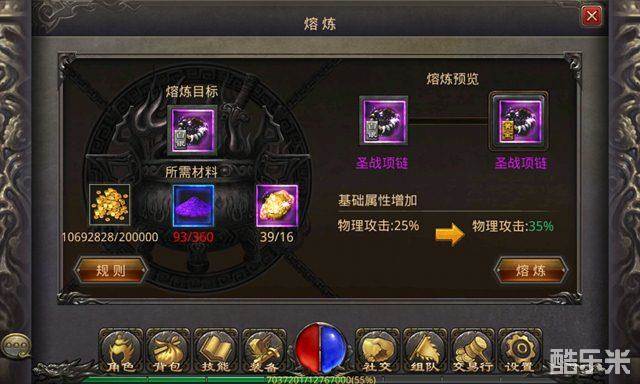 圣战项链从白银档次熔炼提升到黄金档次,物理攻击在原有25%的基础上增加到35%,紫金、赤金档次由于需要的时间和材料较多,小编暂时也没法体验到哦!